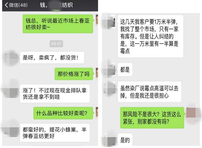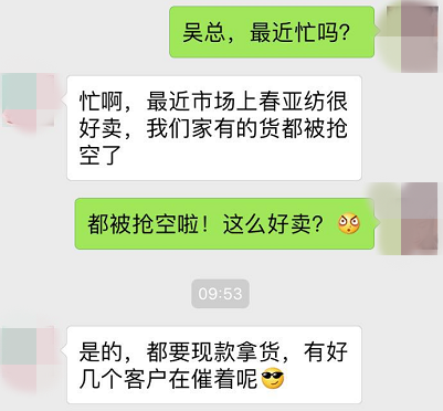 不仅现款拿货、排队等货,居然连囤放了几年有霉点的库存布都不放过,可见整个市场上春亚纺的抢货程度有多火!