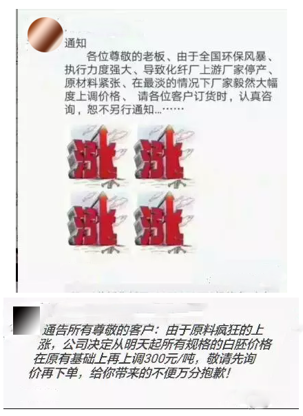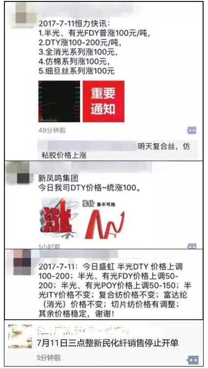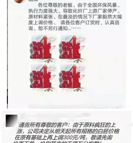 涤纶长丝在涨价的浪潮中是出尽了风头,据绸都网监测的数据来看也是一片飘红。前几天更有各主流大厂上午才通知普遍上调100-200元/吨,下午部分厂家又继续补涨50-100元,部分甚至封盘不卖!朋友圈随处可见的涨价通知: