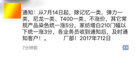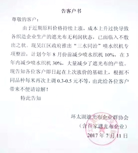 上游原料涨价,染费又跟着“凑热闹”,面料商表示苦不堪言。还在经历着环保,又面临双重涨价,不得已只能顺应涨价潮:7月11日,环太湖遮光布企业群协会发了通知,即日起遮光布根据不同品种每米再次上调0.3-0.5元不等。