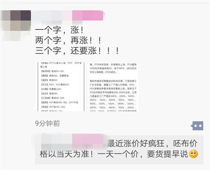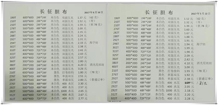 纺织市场紧俏产品的价格也是不断攀升,“一天一个价”虽说有点夸张,但瞧瞧这家胆布超市,短短一月内价格就上调了近八次!仅在个把月,各规格产品累计上涨幅度就高达15%-25%不等。