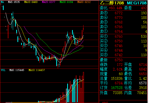 由于短期内资金面已经全面宽松,短端资金利率出现了明显下行, 1天、7天、14天回购利率已经回到了2015年3月之前的水平;在资金面的助力下,近阶段乙二醇市场强势冲高,在12日暴涨行情后,13日当日电子盘盘中几度涨停,延续暴涨势头。在此提振下,现货价格也是大幅高涨,目前其内盘价格大涨至6900-6950元/吨附近。