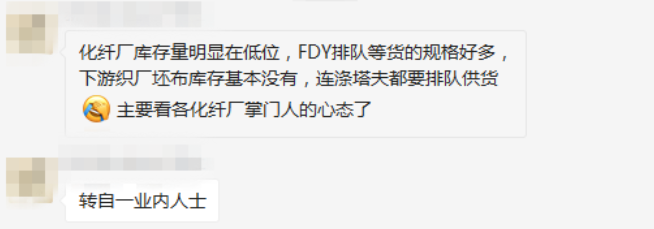 由于吴江喷水牛津布、涤塔夫、仿真丝,海宁经编仿超柔、绍兴圆机摇粒绒和针织类产品均相对动销,织造厂家资金回笼较快,自然对原料的采购积极性也较高。部分业内人士透露,部分化纤厂FDY规格更是出现货源紧张的局面。