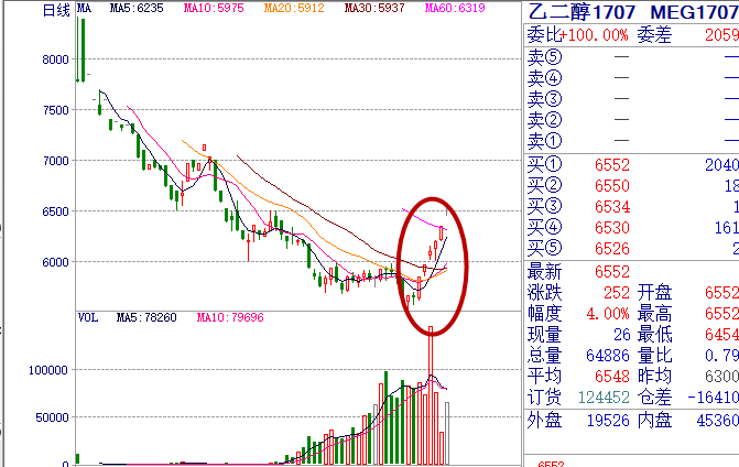 一周接连四个交易日,乙二醇电子盘触及涨停板。周四(5月18日)夜盘乙二醇MEG1707合约开盘后开始一路震荡上涨至涨停,周五(5月19日)早盘开盘后一直处于涨停状态,午盘开盘后继续涨停状态直至收盘。