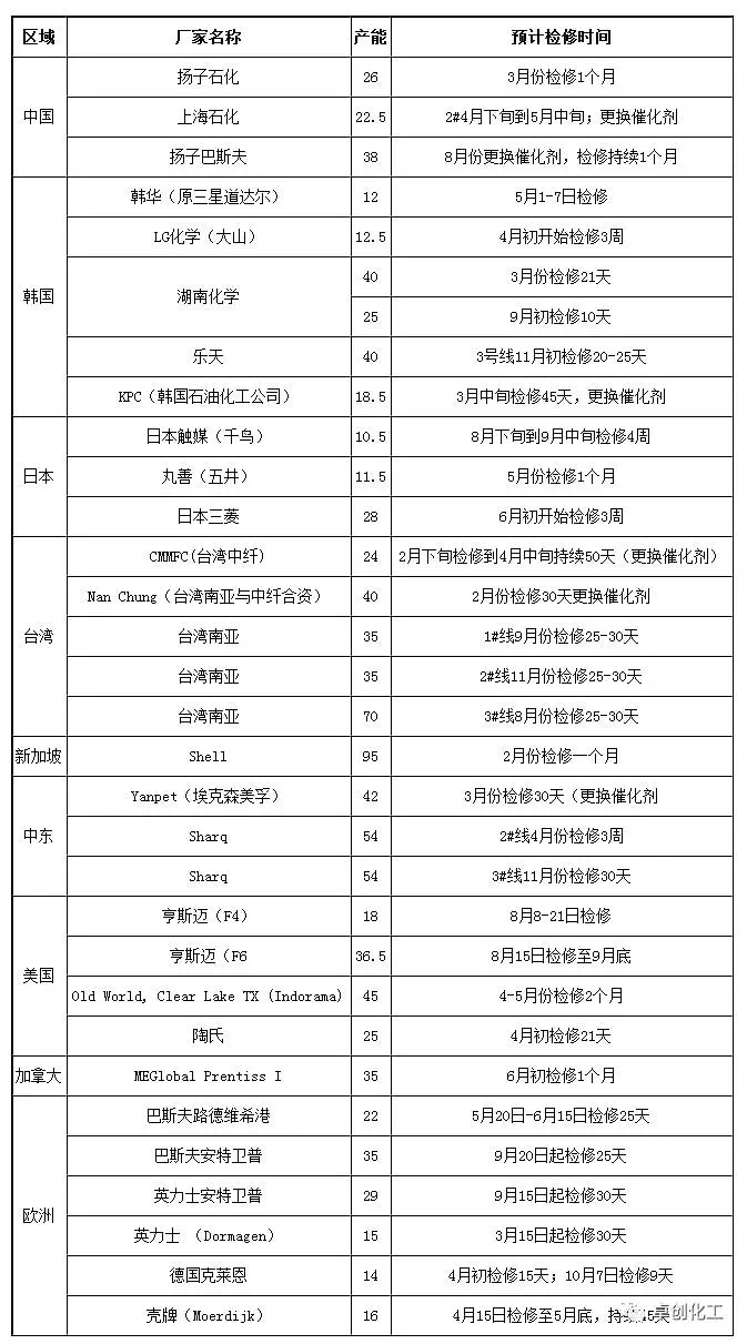 导语:2017年全球乙二醇计划内检修产能涉及1024万吨;其中对中国市场出口较多的日本、韩国、台湾、中东、美国装置检修较为集中,且从时间上看,检修多集中于1季度与4季度;受检修密集…