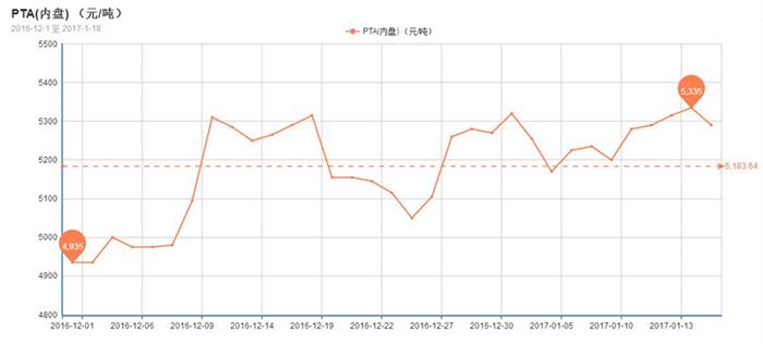 2016年末,聚酯行情经历了一波“疯牛”行情,乙二醇价格飙升超1600元/吨;涤纶长丝、聚酯切片价格也上涨千元附近,12月聚酯产业链集体狂欢下,唯独PTA暗自神伤,价格难有实质性的突破。经过了一个月的震荡行情之后,2017年1月份,PTA内盘价格止跌回升,稳稳地徘徊在5200-5300这一关键位。