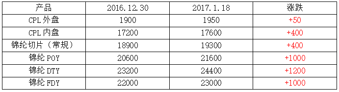 总体,2017年春节期间锦纶行业开机较往年大幅提升,市场格局稳中走强。此外,随着近期原料纯苯和己内酰胺价格仍维持坚挺,下游以锦纶丝为原料的面料市场也逐渐回暖,预计春节及春节后锦纶丝价或以上涨为主。