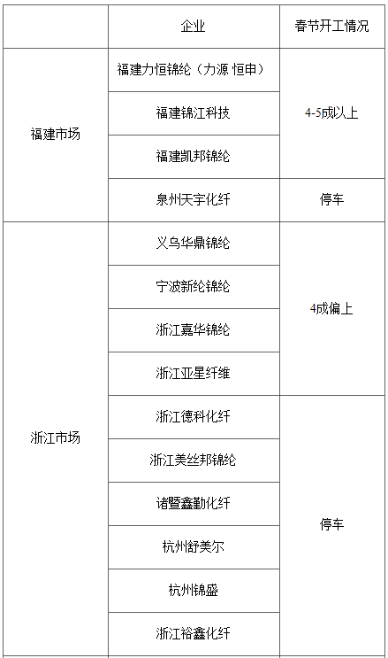 从上图可见,往年春节期间锦纶行业整体开机稳中偏弱,开机维持在4-5成,此外,停车的厂家也比较多,江浙地区一半以上企业选择停车、停产、检修来度过春节假期。下面我们再来看看今年春节的开机情况: