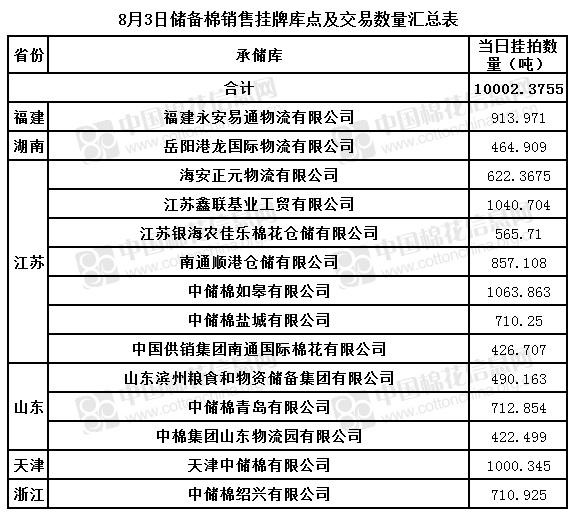 8月3日储备棉销售挂牌库点及数量