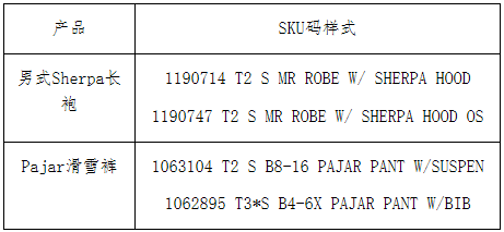2023年1月12日,加拿大卫生部宣布对中国产男式Sherpa长袍和Pajar滑雪裤实施召回,具体信息如下: