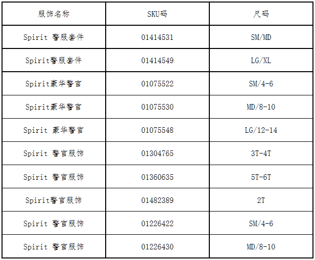 此次召回产品涉及以下警服套装中的警帽。不包含在召回范围内的产品可通过帽子内的标签来识别,标签上有“Made in China”的字样。受影响的产品不包含此标签。