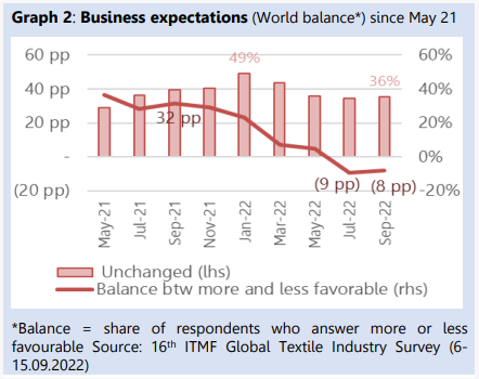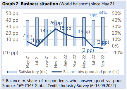 据国际纺织联盟(ITMF)于2022年9月28日发布第16次全球纺织产业调查报告(GTIS)显示,本年9月全球纺织业营运状况恶化,对未来营运预期续呈悲观。全球订单量、未交货订单及产能利用率也皆下降。