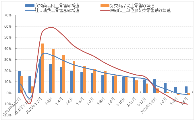 5月,在疫情防控形势总体向好及促消费等政策落地显效的共同作用下,国内市场需求逐步好转,服装内销降幅收窄,实体和线上零售均有所改善。据国家统计局数据,5月当月限额以上单位服装类商品零售额同比下降20.1%,降幅比4月收窄5.5个百分点;1-5月我国限额以上单位服装类商品零售额累计3623.3亿元,同比下降10.1%,降幅比1-4月继续扩大2.6个百分点。据中华全国商业信息中心数据,5月全国重点大型零售企业服装零售额同比下降29.94%,降幅比4月收窄9.92个百分点。同时,物流通畅程度、运输效率的不断提升,对线上消费起到一定的拉动作用。1-5月穿类商品网上零售额同比下降1.6%,降幅比1-4月收窄0.1个百分点。
