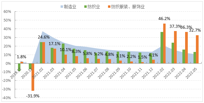 在国家稳增长、助企纾困等各项税收优惠、融资支持政策加码发力的带动下,服装企业持续深化转型升级,积极扩大技术改造升级、智能制造及区域布局调整等领域的有效投资,及受上年同期低基数因素影响,我国服装行业投资实现较快的反弹式增长,增速逐月回落。据国家统计局数据,1-5月我国服装行业固定资产投资完成额同比增长32.7%,增速比2021年同期提升24.4个百分点,比1-4月回落3.6个百分点。