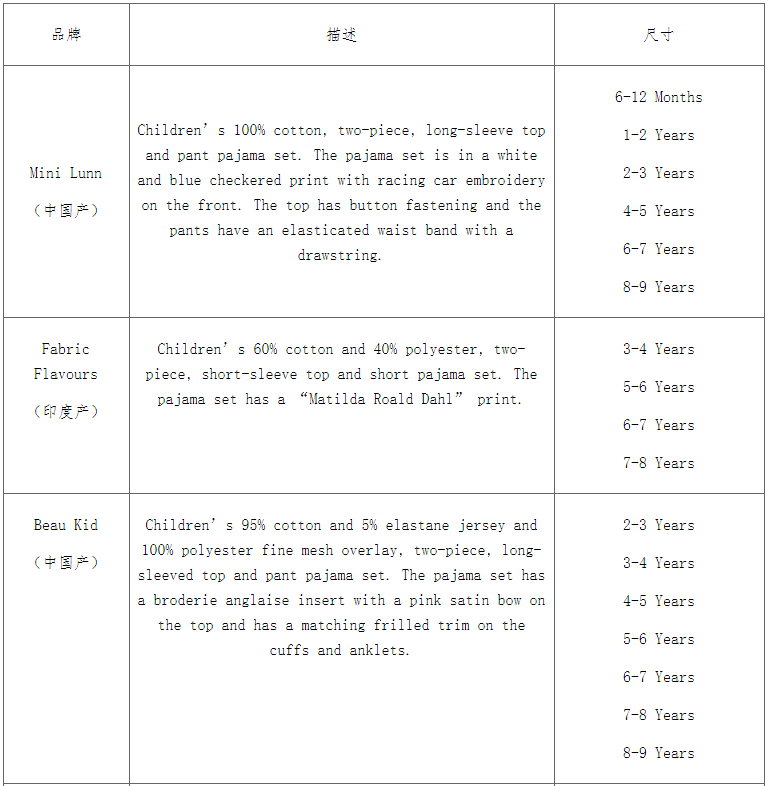 此次召回产品为5款儿童睡衣。具体召回产品信息如下: