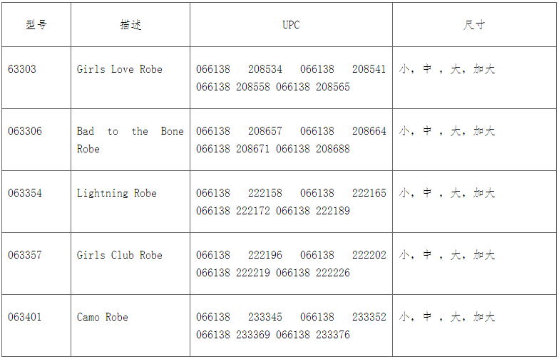 此次召回产品为JoeBoxer儿童羊毛长袍。具体召回产品信息如下: