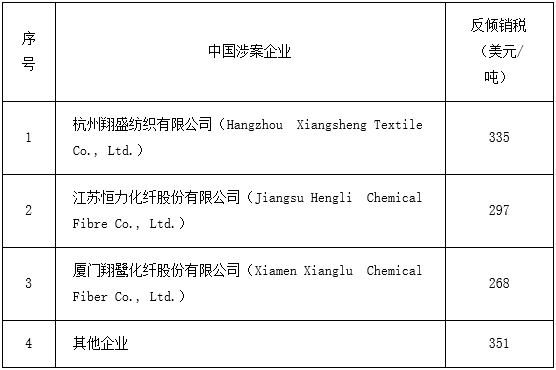 2021年2月3日,土耳其贸易部发布第2021/6号公告,对原产于中国、印度尼西亚、马来西亚、泰国、越南聚酯纱线作出反倾销日落复审肯定性终裁,维持上述国家涉案产品的反倾销税,中国为268-351美元/吨(详见下表)、印度尼西亚为48-240美元/吨、马来西亚为276美元/吨、泰国为到岸价(CIF)