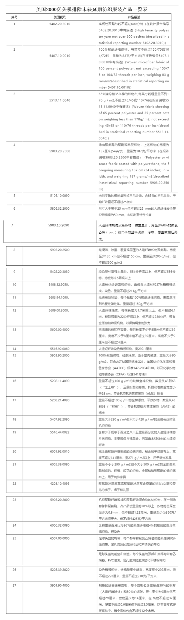 本次修订的纺织品描述与HS码如下,出口企业需重新审查是否符合排除条件: